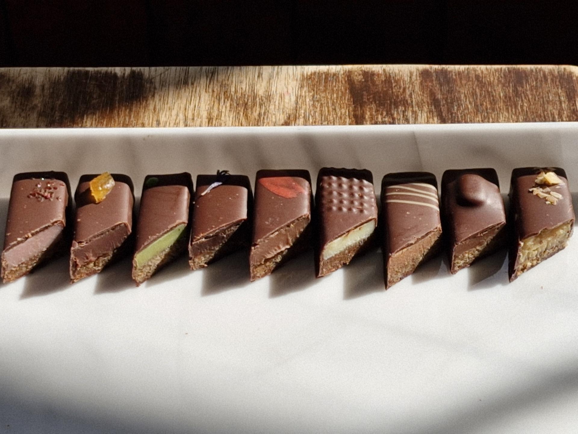 메이플과 레몬제스트가 어우러지는 고소한 아몬드마지판스틱 위에 6가지의 생초콜릿 가나슈를 쌓은 2단레이어의 스틱초콜릿입니다.